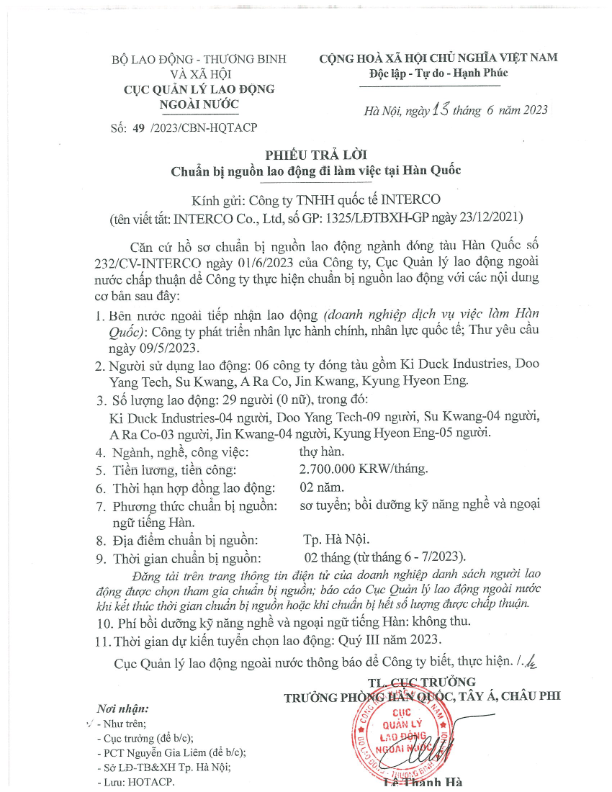 Thị trường lao động Hàn Quốc đang dần mở cửa trở lại và sôi động hơn bao giờ hết. Nắm bắt được nhu cầu thị trường, công ty chúng tôi đã tiến hành làm việc với các đối tác bên Hàn Quốc và đã được chấp thuận đưa lao động của mình sang thị trường tiềm năng này. Dưới đây là phiếu trả lời đã được cục quản lý lao động ngoài nước duyệt và danh sách 21 lao động công ty đưa đi.