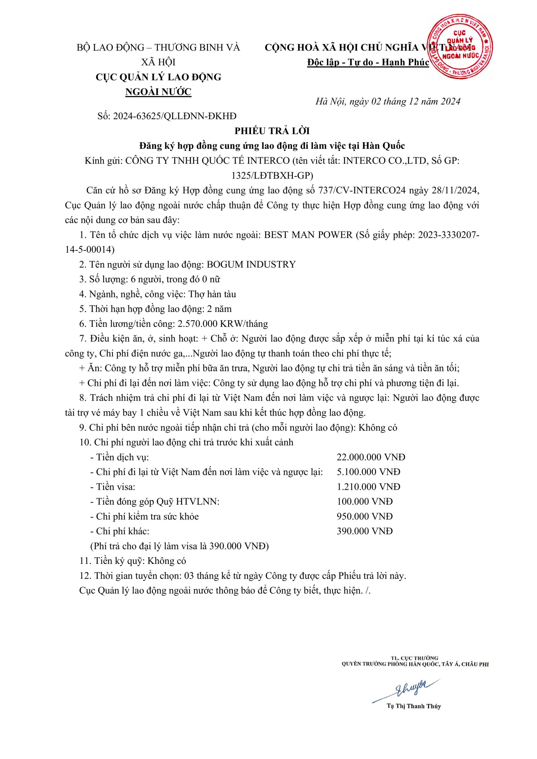 - Phiếu trả lời Cục QLLĐNN và Danh sách thi tuyển lao động đi làm việc tại Hàn Quốc (Visa E-7-3)