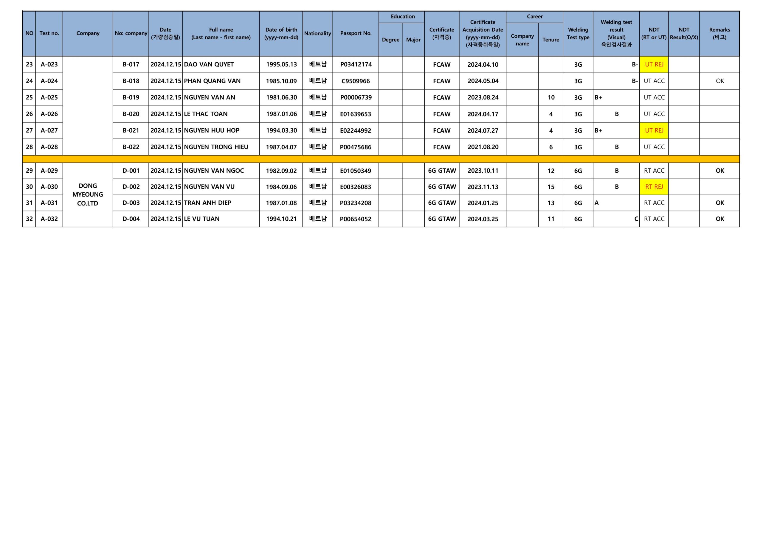 - Phiếu trả lời Cục QLLĐNN và Danh sách thi tuyển lao động đi làm việc tại Hàn Quốc (Visa E-7-3) 26.04.2025